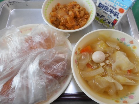 今日の給食は、ミニパン、あげパン、チリコンカン、うずら卵入り野菜スープ、牛乳、でした。