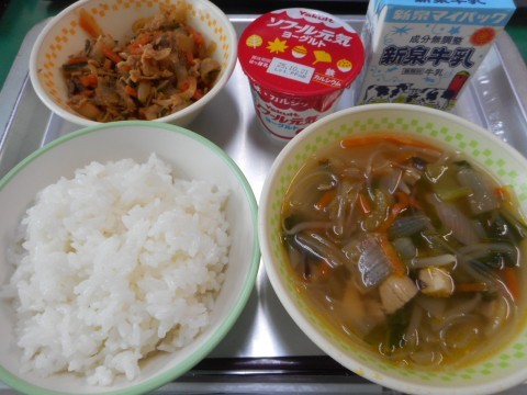 今日の給食は、ごはん、スタミナ丼、春雨スープ、ヨーグルト、牛乳、でした。
