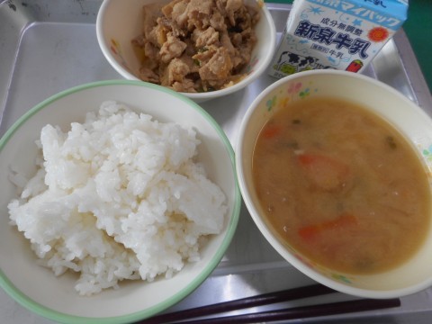 今日の給食は、ごはん、ちゃんこ汁、豚肉の生姜炒め、牛乳、でした。