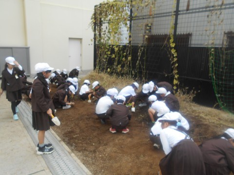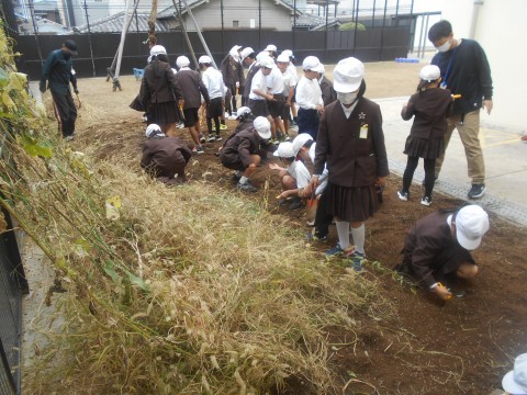 スコップを持って、学習園を整備していました。土の中からいろいろ発見している人もいました。