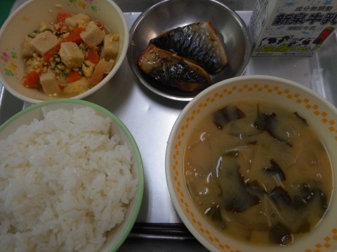 今日の給食は、ごはん、みそ汁、焼き鯖、高野豆腐の卵とじ、牛乳、でした。