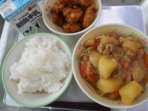 今日の給食は、ごはん、肉じゃが、チキン南蛮、牛乳、でした。