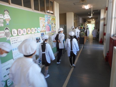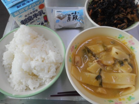 今日の給食は、ごはん、ほうとう、ひじきの甘煮、小魚の佃煮、牛乳、でした。