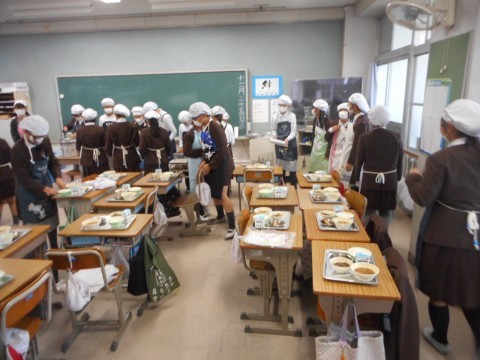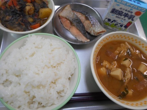 今日の給食は、ごはん、赤だし、焼鮭、ジャガイモのいそ煮、牛乳、でした。