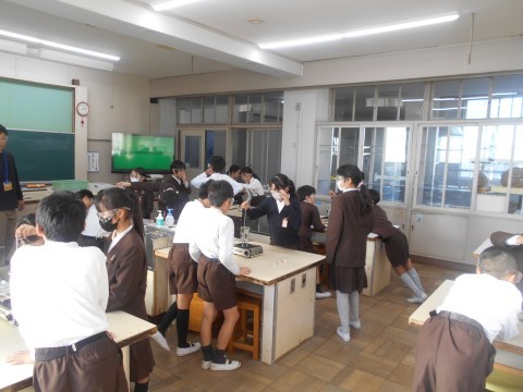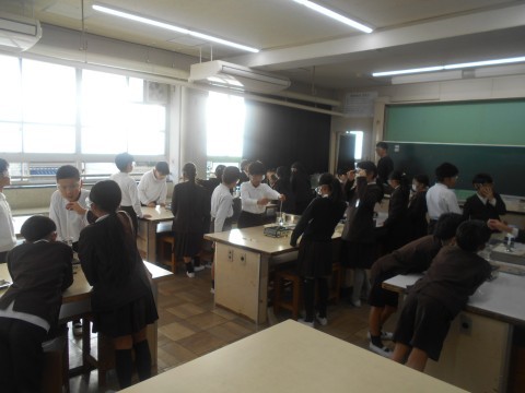 水を沸騰させる実験です。水は温度によってどのようにすがたをかえるか、学習していました。安全に気を付けて実験していました。