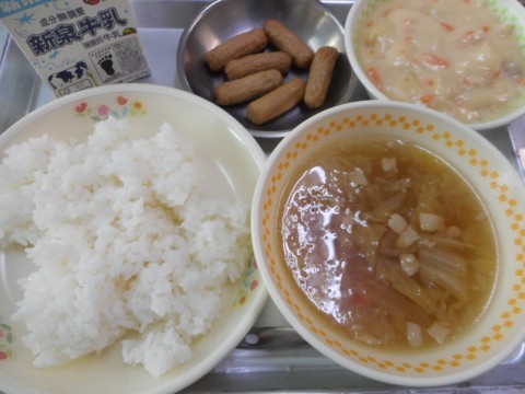 今日の給食は、ごはん、コンソメスープ、焼きウインナー、かけたらクリームドリア、牛乳、でした。