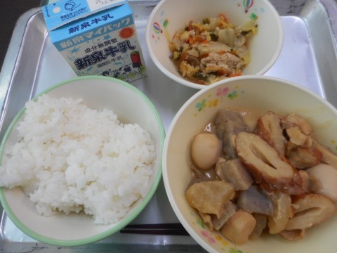 今日の給食は、ごはん、みそおでん、大阪しろなと豚肉の煮びたし、牛乳、でした。