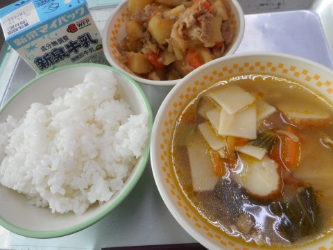 今日の給食は、ごはん、ワンタン、中華風肉じゃが、牛乳、でした。