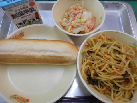 今日の給食は、ミニコッペパン、じゃこと小松菜のスパゲティ、花野菜のマヨネーズ風味焼き、牛乳、でした。
