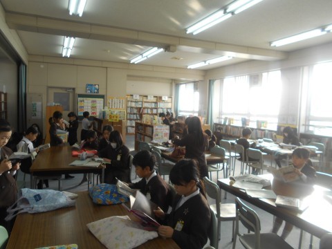 学校図書館(図書室)で図書の時間でした。次はどの本を読もうかじっくり選んでいました。