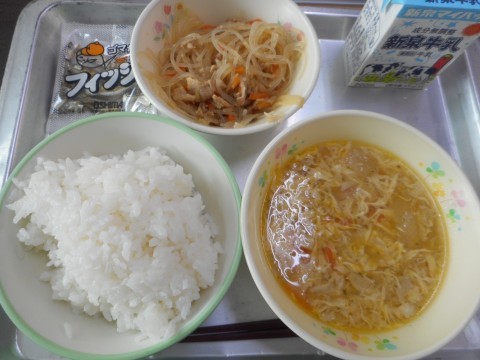 今日の給食は、ごはん、中華風たまごとコーンのスープ、麻婆春雨、ミニフィッシュ、牛乳、でした。