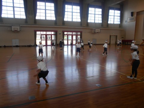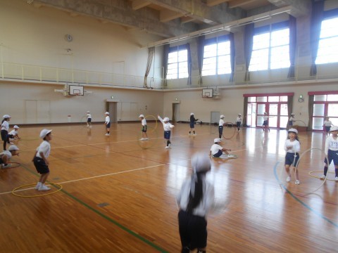フラフープを使った運動をしていました。上手に転がしたりキャッチしたりしていました。