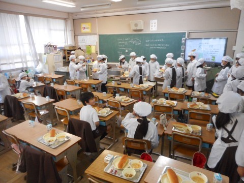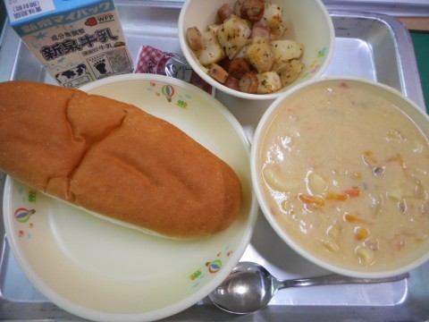 今日の給食は、コッペパン、クリーミーコーンの豆乳スープ、ガーリックポテト、チョコレートクリーム、牛乳、でした。