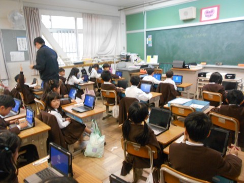 パソコンを使って生活アンケートに答えていました。