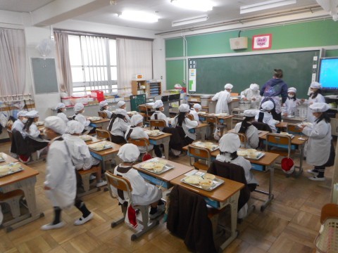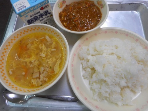 今日の給食は、ごはん、たまごスープ、ドライカレー、牛乳、でした。