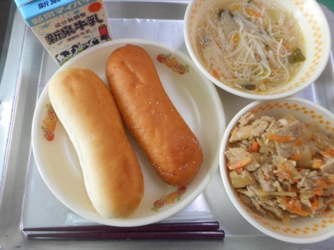 今日の給食は、ミニパン、あげパン、ビーフンスープ、豚肉のゴマ風味、牛乳、でした。