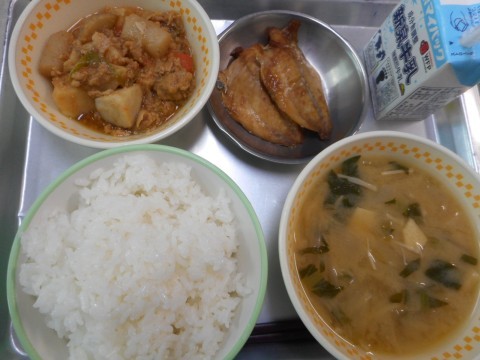 今日の給食は、ごはん、みそ汁、芋煮、アジのみりん干し、牛乳、でした。