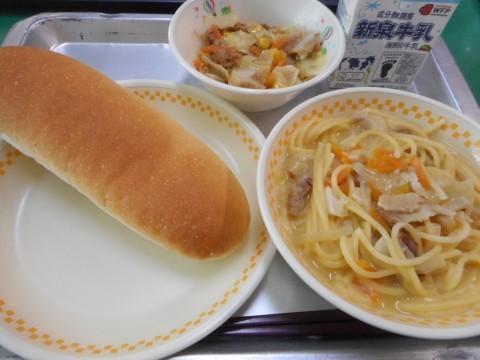 今日の給食は、ミニコッペパン、クリームスパゲティ、ホットサラダ、牛乳、でした。