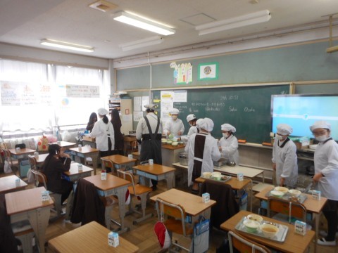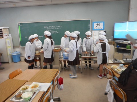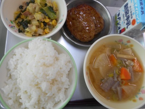 今日の給食は、ごはん、さつま汁、照り焼きハンバーグ、小松菜と白菜の炒め煮、牛乳、でした。