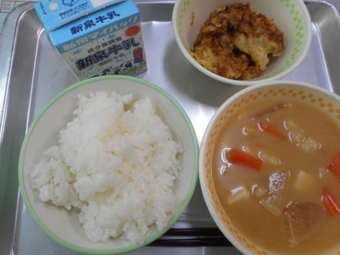今日の給食は、ごはん、五目汁、お好み焼き、牛乳、でした。