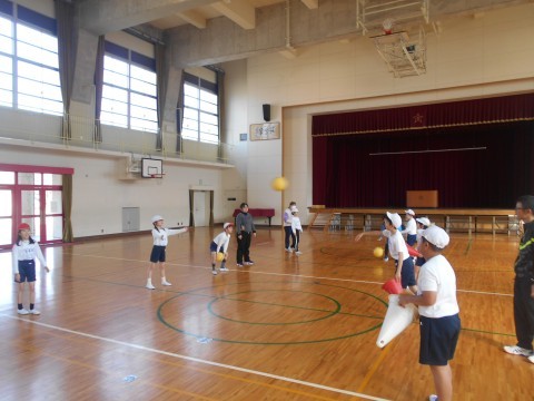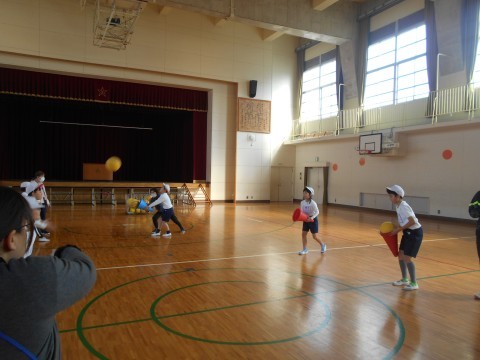 やわらかいボールとコーンを使って、ボール運動をしていました。受ける人が、コーンでうまくキャッチできるように、投げる人は、工夫して優しくボールを投げていました。ペアで協力していました。