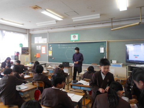多角形の学習をしていました。コンパスを使って正多角形を描き、その名前と名前の理由を考える活動をしていました。