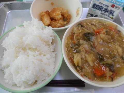 今日の給食は、ごはん、八宝菜、ユーリンチー、牛乳、でした。