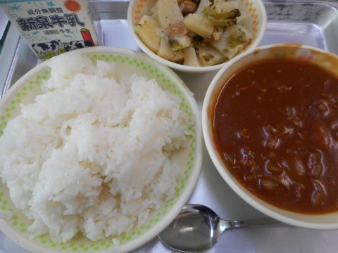 今日の給食は、ごはん、ハヤシライス、じゃがいものチーズ焼き、牛乳、でした。