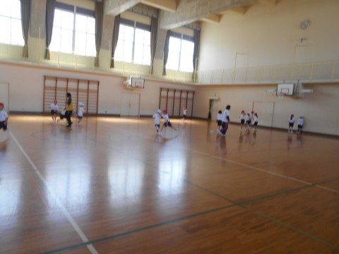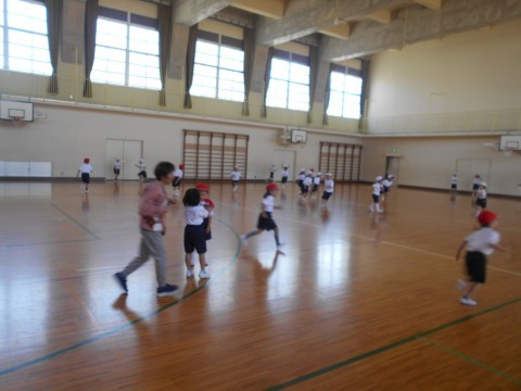 体育館で体育の学習をしていました。ルールを守り、元気いっぱいおにごっこをしていました。