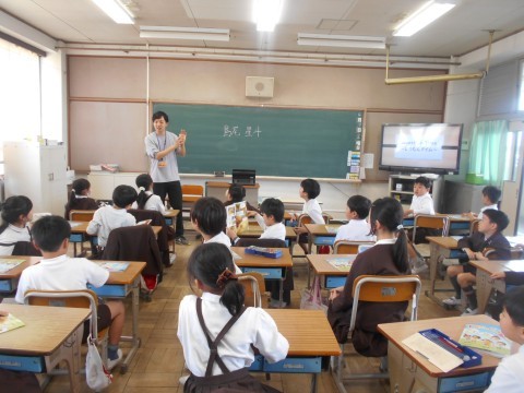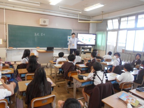3年生から外国語活動が始まりました。はじめは、先生が英語で自己紹介をしていました。