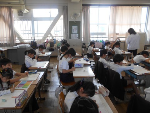 2桁のかけ算の答えを求める方法を考えていました。集中して取り組んでいました。