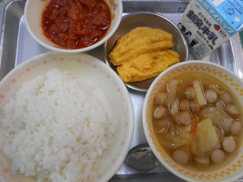 今日の給食は、ごはん、野菜スープ、オムレツ、セルフチキンライス、牛乳、でした。