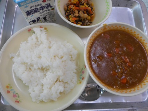 今日の給食は、ごはん、ポークカレーライス、豆とひじきのサラダ、牛乳、でした。