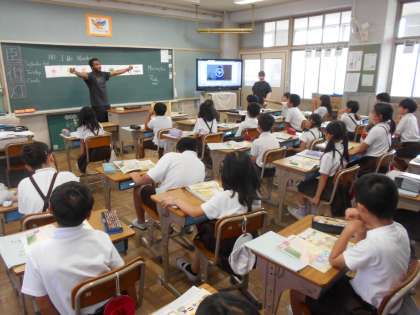 映像を見ながら世界の子どもたちの生活について知ることができ、NSの先生の質問にも答えることができていました。