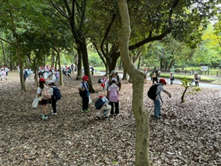 どんぐりや葉っぱを拾っています。