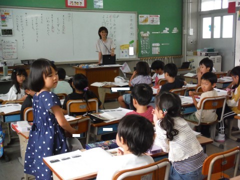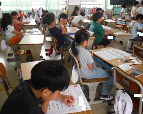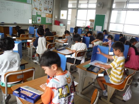 (上の写真)算数の時間の様子です。今日はテストをしていました。しっかり読んで問題を解いていました。(中の写真)こちらでは算数のテスト返しの時間でした。まちがったところを直し,先生に確認してもらいました。(下の写真)国語の時間の様子です。今日は,『うみのかくれんぼ』を読んで,何がどのように,どこにかくれているのかを見つけていました。