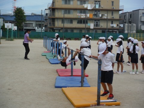 (上の写真)算数の時間の様子です。今日は,7の段の九九の勉強をしました。7のまとまりが1つずつ増えるとどうなるのかを式で表しました。(中の写真)書写の時間の様子です。今日は,「画のつき方と交わり方」に着目して練習しました。(下の写真)体育の時間の様子です。今日は,鉄棒で,足かけあがりや腕立て前転,あしぬき回りなどの技に挑戦しました。