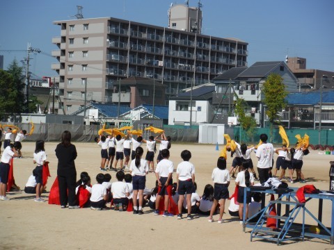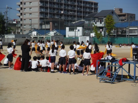 5年生の体育参観の練習の時間の様子です。団体演技の手具をもってはじめての練習です。クラスごとにカラーが違います。ハンカチーフがはためいてとてもきれいです。今日は,それぞれのクラスで見せ合いをしました。