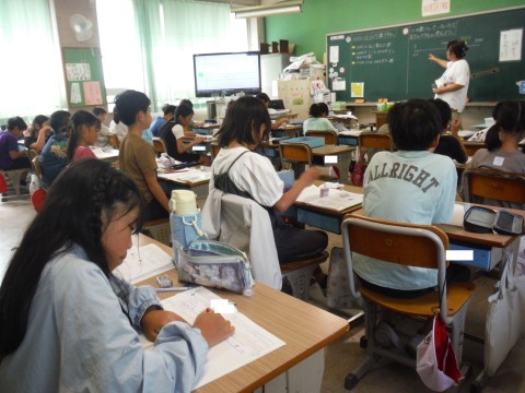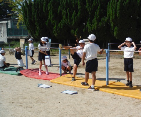 (上の写真)体育の時間の様子です。今日は,運動場で鉄棒をしました。足かけ上がりをしたり,こうもりの技をしたりしました。(下の写真)算数の時間の様子です。今日は,大きな数の勉強をしていました。数直線のめもりを読み取りながら進めていました。