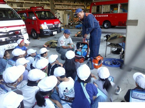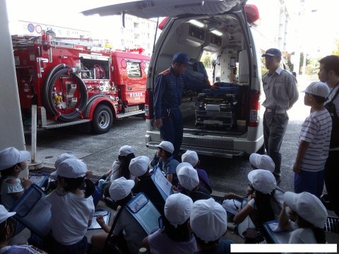 今日は,北消防署の見学に行ってきました。消防署の方にご挨拶をした後に,消防車や救急車の仕組みについて教えていただきました!!実際にはしご車のはしごの部分を伸ばしていただいたときには,歓声があがっていましたよ☆彡