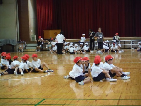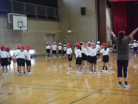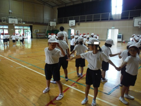 体育参観の練習の様子です。団体演技のダンスの練習をしていました。ちょうど円に隊形がかわりました。手をつないだり,グループで回ったりととっても上手に踊っていました。小学校で初めての体育参観ですね。楽しみですね。