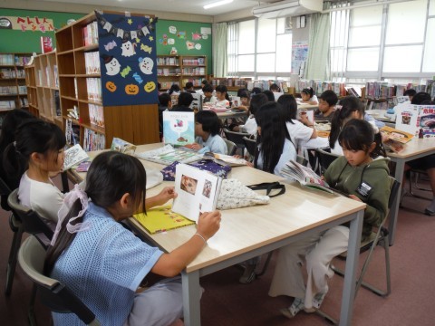 (上の写真)算数の時間の様子です。今日は,三角形と四角形のなかまわけをしていました。辺や頂点の数,直線に囲まれているかどうかをみて判断していましたよ。(中の写真)図書の時間の様子です。とっても静かな時間でした。みんなが集中して読書をしていました。(下の写真)図工の時間の様子です。今日は,版画に取り組んでいました。お気に入りの動物の絵の下絵に,様々な模様の紙を形にあわせて切ったり,貼ったりしました。
