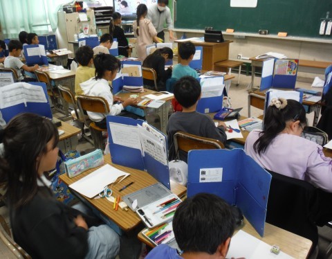(上の写真)図工の時間の様子です。今日は,「このカタチへんしんすると」で表と裏の絵が変身するクイズを作っているようです。(下の写真)算数の時間の様子です。今日は,3つの数のかけ算について学習しました。はじめの2つの数を先に計算しても,あとの2つの数を先に計算しても,答えが同じになることを活用しながら問題を解きました。