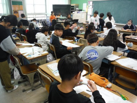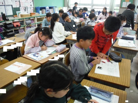 (上の写真)書写の時間の様子です。今日は,半紙をつなぎ合わせて条幅紙を作りました。大きな文字を書くことが楽しみですね。(中の写真)算数の時間の様子です。今日は,積と商の見積もりについて考えました。どのように計算をしたらいいのかを見当をつけて計算しました。(下の写真)国語の時間の様子です。今日は,国語『未来につながる工芸品』において,筆者が伝えたいことを要約しました。大切なことばを落とさないようにまとめてくださいね。