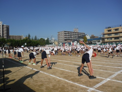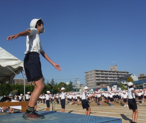 体育委員の児童が前に出て,堺っ子体操をしました。しっかり体操して,体をめざめさせました!!いよいよ各学年の種目が始まります。