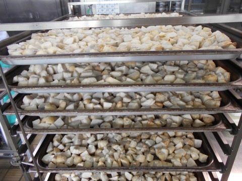 切った里芋に片栗粉と油をまぶして,オーブンで焼きました。