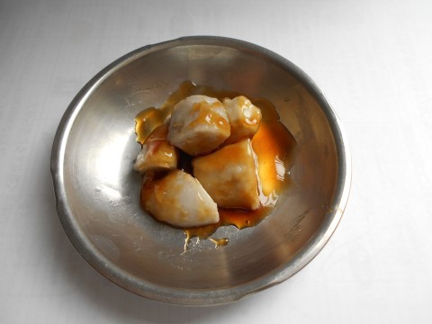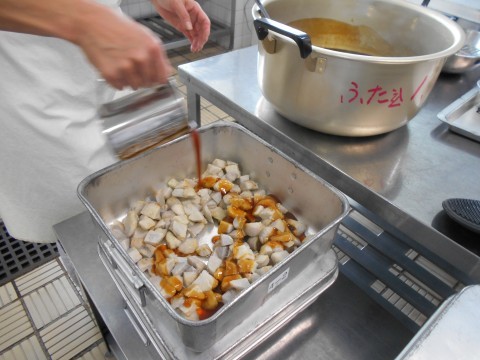 その上に,しょうゆ・さとう・みりんで味付けして,片栗粉でとろみをつけたタレをかけて仕上げました。