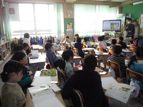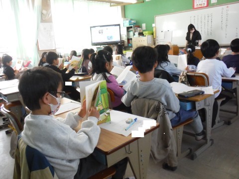 (上の写真)国語の時間の様子です。今日は,『どんなおはなしができるかな』というところで,1枚の絵を見ながら,登場している動物がどんな台詞を言っているのかを考えていました。(下の写真)国語の時間の様子です。今日は,『たぬきの糸ぐるま』において,登場人物のおかみさんの気持ちについて考えました。そして,みんなで音読をしました。