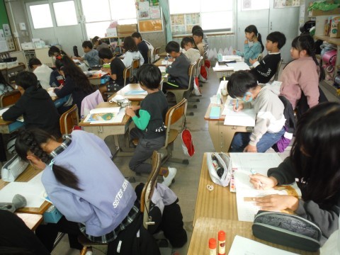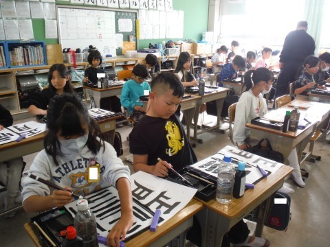 (上の写真)国語の時間の様子です。今日は,『三年とうげ』というお話において,はじめと終わと誰が,どのように変わったのかについて考えていました。教科書に線を引きながらしっかり考えていました。(下の写真)書写の時間の様子です。今日は,『正月』を毛筆で書きました。始筆と終筆の筆の置き方に気をつけていました。力強い横画と縦画でした。
