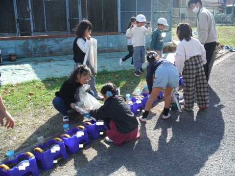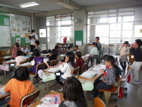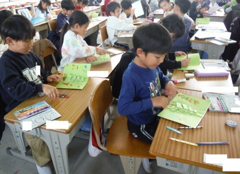 (上の写真)音楽の時間の様子です。今日は,「やまびこ ごっこ」の歌のテストをしました。歌う時の姿勢や声の大きさに気をつけて歌いました!!手拍子も聞こえてきました。(中の写真)生活科の時間の準備をしていました。みんなで鉢に土を入れていました。チューリップの球根を植えるそうです。(下の写真)今日は,クリスマスカード作りをしました。サンタクロースや靴下,ツリーなどとっても上手にえがいていました。